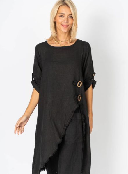 This unique tunic is perfect for transitioning into fall. The large buttons on front and asymmetrical opening add so much interest to any outfit, great for pairing with printed jogger. Simple, breathable linen is great for any time of year. One Size. Made in Italy.