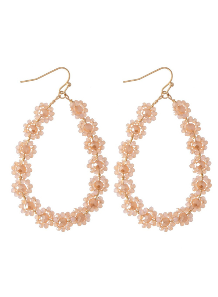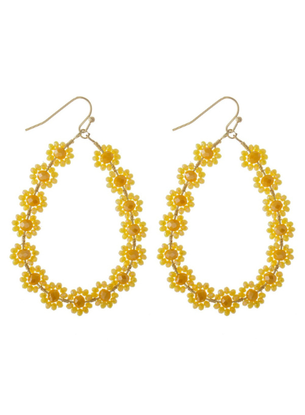 These teardrop shaped earrings have a dainty fun beaded flower design that goes all around the shape. Perfect for pairing with a new spring outfit!