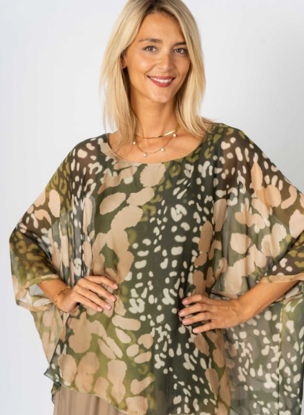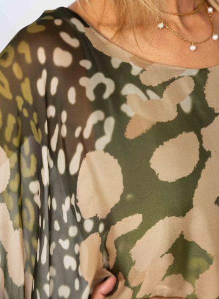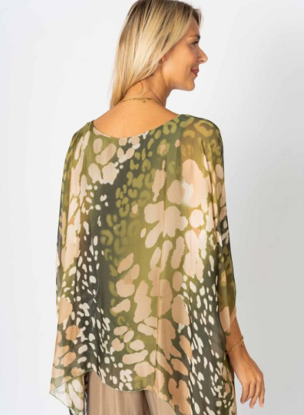 Cheetah printed silk blouse with a breathable cotton and elastic lining. The earthy olive and brown tones are perfect for fall! One size fits most. Made in Italy.
