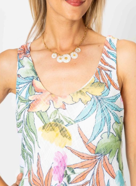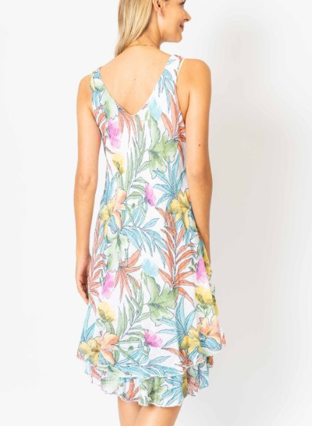 This lovely made in Italy cotton/linen dress is effortless to wear and will garner compliments everytime. Dress it up with heels or go for a more casual sandal. Flattering V-Neck front and back, it's fully lined with a pretty double layer bottom. Size S/M.