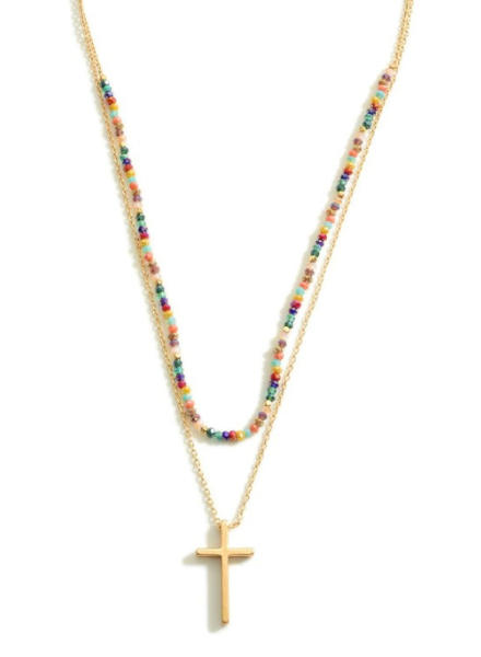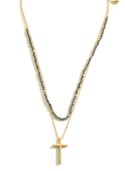 A dainty double strand gold toned chain necklace with sliding cross charm and small beads. Lobster clasp, measures approx. 18" in length. (Matching earrings pictured sold separately)