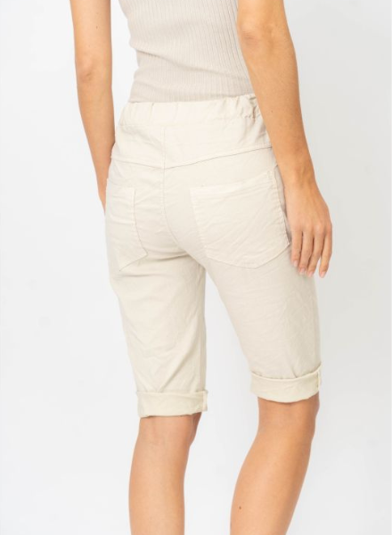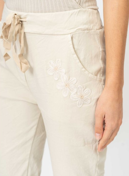 Available in two adjustable sizes: S/M or L/XL, these shorts are a modest "Bermuda" length with the option to be cuffed or uncuffed. A drawstring waist allows for adjustable comfort with additional stretch in the leg. Embroidered flowers at the pocket add a little touch of interest. Made in Italy.