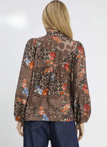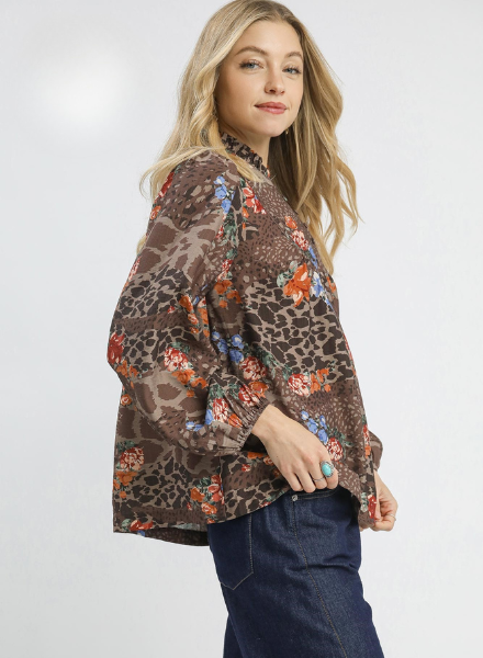 This blouse is perfect for integrating into your fall wardrobe. The rich browns with mixed animal prints combined with red, orange and blue florals creates a beautiful and warm print. Long sleeved with elastic gathered cuffs and a round front yoke.