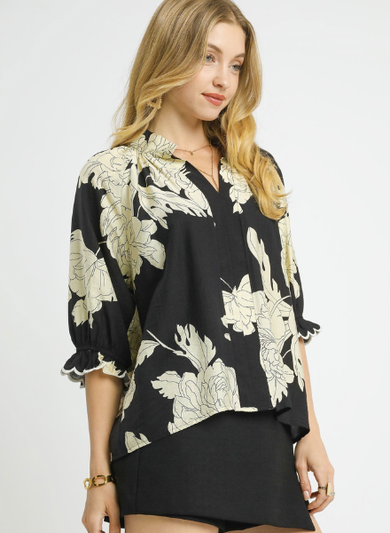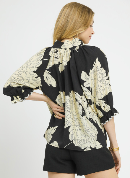 A classy blouse in black with creamy off-white large scale flowers printed throughout. Everyone looks good in this classic combo! A wonderful blouse that will carry you through all seasons.