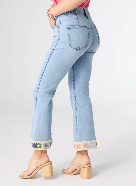 Welcome spring with our new floral crochet bottom crop flare jeans that will make you feel like you're walking in a field of flowers. Soft and comfortable 4-way stretch fit with a special cotton, polyester, viscose, and spandex blend. They get better and better with every wash. Added stretch in the waistband that never cuts and buttons that never dig gives comfort to everyday wear. 26" inseam. Small fits 4-6, Medium 8-10, Large 12-14, XL 16-18.