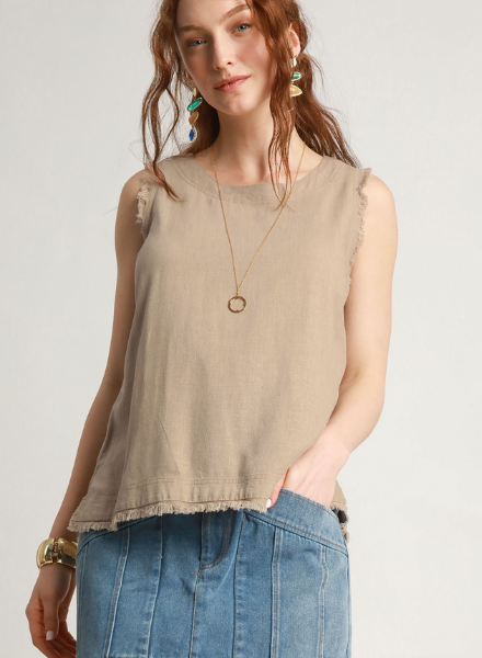 This linen blend sleeveless top is perfect for the warmer months. The frayed edges, button back and side slits gives it some fashion forward style. The relaxed fit makes it so easy and comfortable to wear. A favorite in store! Sizes S-M-L. 55% Linen, 45% Cotton.
