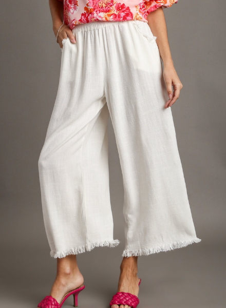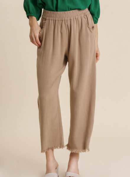 This linen pant is easy with its elastic waist, pockets, and pretty frayed hem. A hit in-store. Sizes S, M & L with Plus Sizes available here. 55% linen, 45% cotton. Great in the hotter months with sandals or for transitional weather with booties!