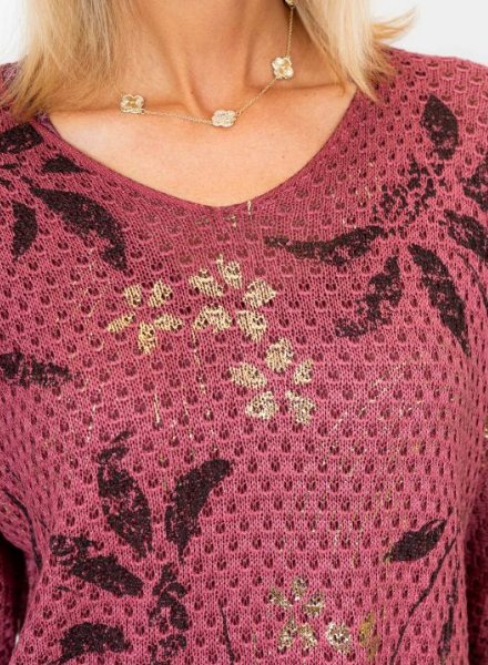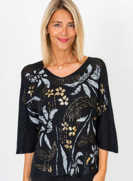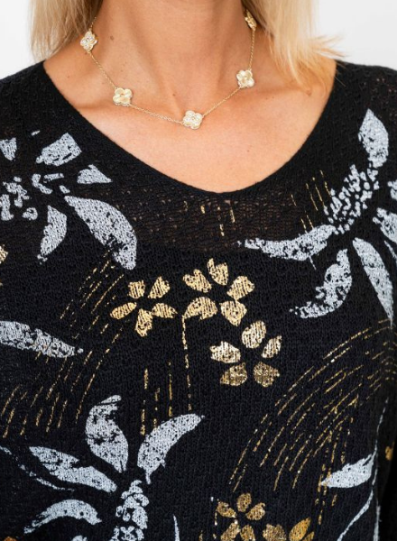 A lightweight knit sweater with unique gold foil printed flowers and leaves, a timeless piece that can be worn any time anywhere! Layer with one of our reversible tank tops for a layered effortless look. One size fits most. Made in Italy.