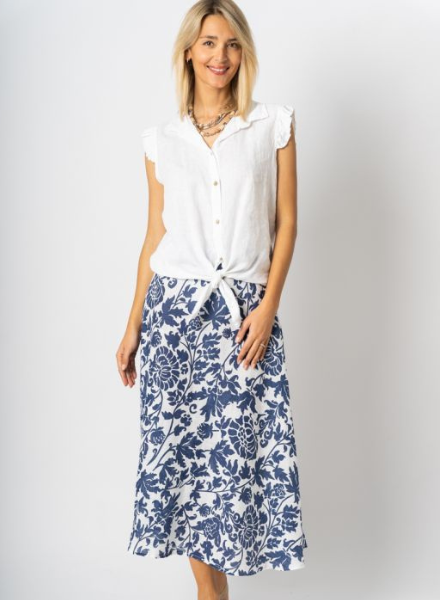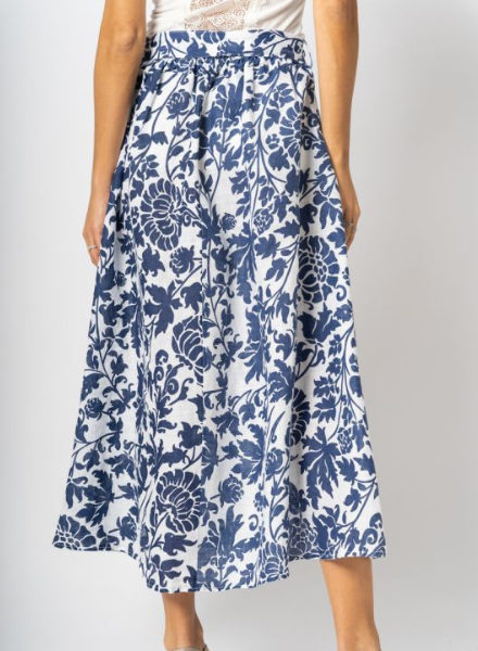 Feel classy and comfortable in this tea-length, flowing linen skirt with a simple navy blue and white floral damask pattern. Pair it with a crisp white linen top for a complete summer vacay outfit. Made in Italy.