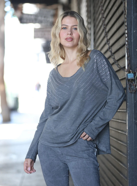 This long sleeve tee is perfect for transitioning into Fall. Lightweight enough to wear before the weather cools all the way down, and great for layering when it does! Subtle sparkling silver sequins adorn the neckline and shoulders for an added special detail. One size fits most. Made in Italy.