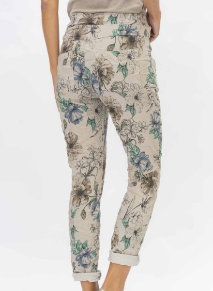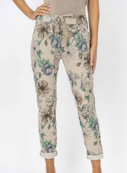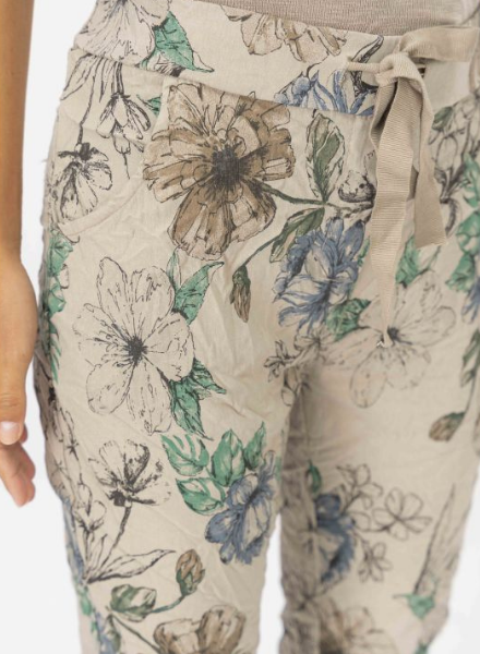 Effortless joggers with a neutral floral print. Touches of blue and green pop on the simple lined flower print. An adjustable drawstring waist allows for custom comfort with additional stretch in the leg. One size fits most. Made in Italy.