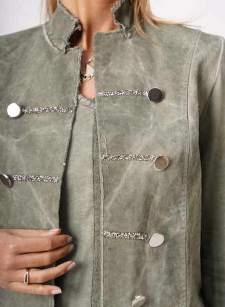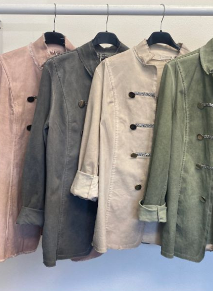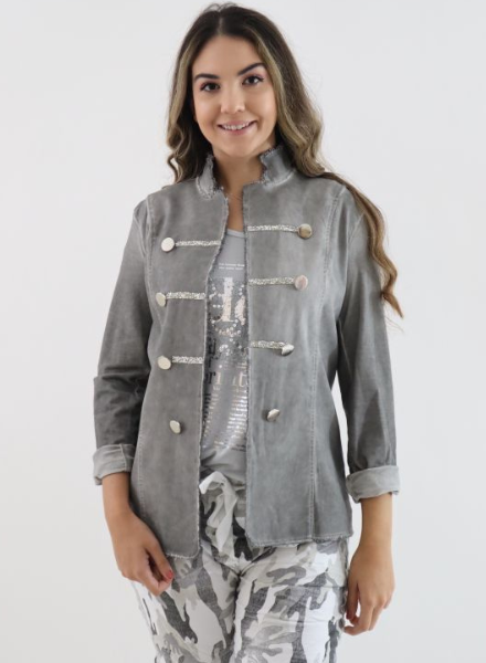 This artful, classic made in Italy jacket is a favorite in our stores. Pretty silver metallic trim with decorative buttons for this open closure jacket. Two sizes: small/medium and large/extra large. 100% cotton.