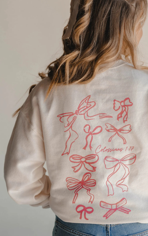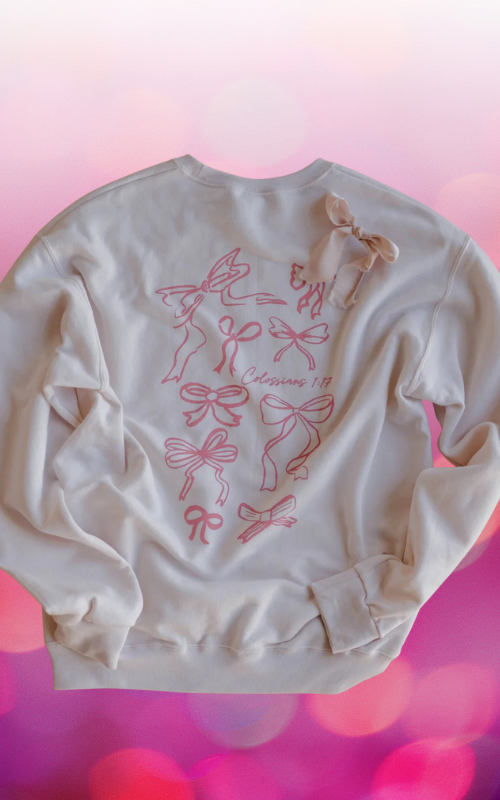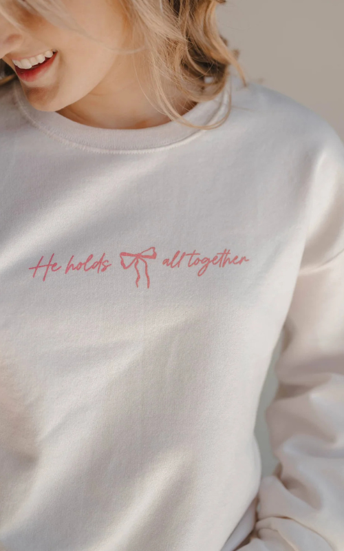 This ivory pullover with a variety of pink bows is a lovely way to remind us that He holds it all together! Made of 50/50 cotton/polyester, it is pre-shrunk.