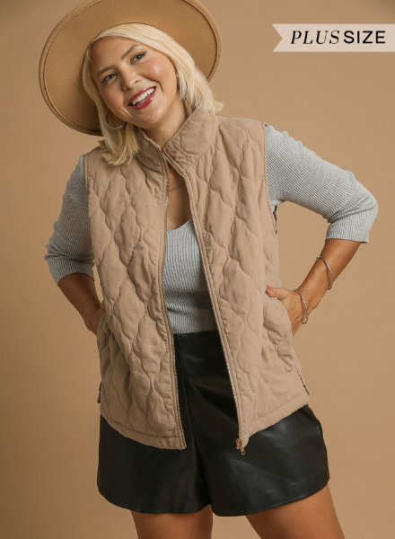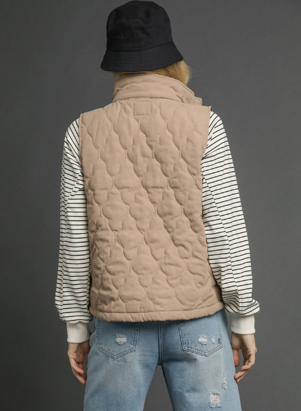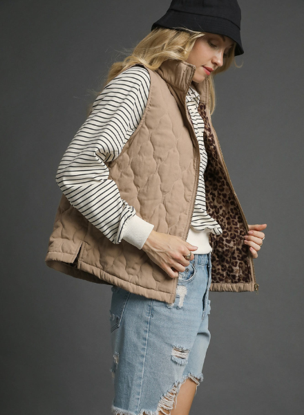 This little vest is a practical piece for bringing into the colder months. It also has a fashion forward edge with a leopard print interior. Layer your favorite long sleeve tee or thermal with this quilted puffer vest. Full front zipper closure with side slits for ventilation. Available in a nice taupe color, perfect for Fall!