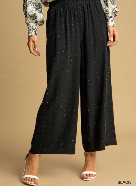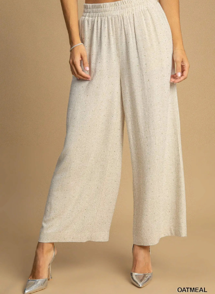 This pant is a sister to our popular Frayed Hem Easy Pant with an in-style wide leg and elastic waist. This pant takes it up a notch with perfectly place subtle rhinestones on the front of the pants and a clean hem. Great for the holidays and year round. Sizes small to large. Same beautiful blend as our Frayed Hem Easy Pants: 55% linen, 45% cotton.
