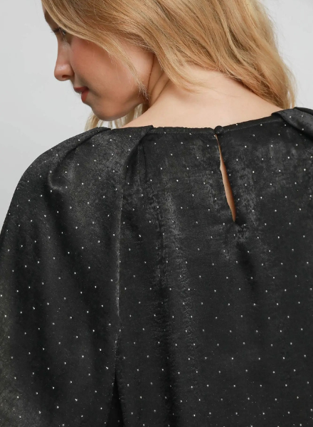 The subtle sparkle on this top paired with the pretty balloon sleeve that hits at just the right place makes this satin top a winner. Sizes small to large.