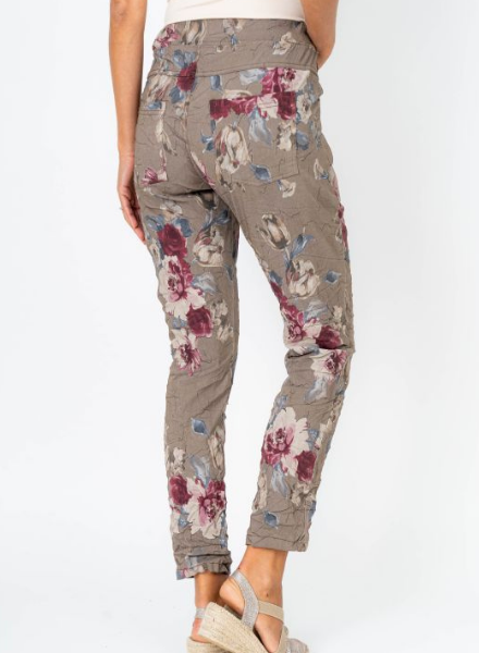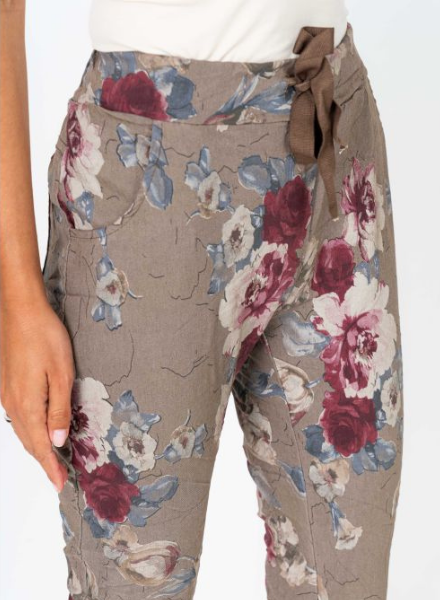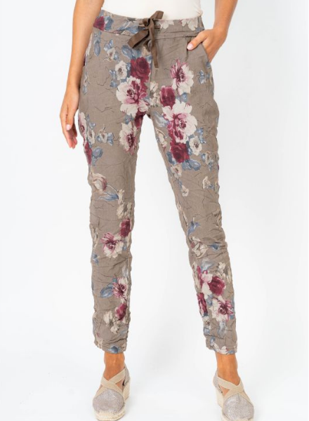 Beautiful maroon and cream roses pop on these taupe Italian made joggers. Adjustable drawstring waist allows for custom comfort with additional stretch in the leg. Available in L/XL.