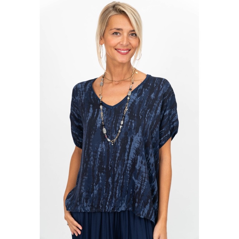 This Made in Italy bamboo print top with a graceful V neck is easy to wear and elegant. One size. 70% viscose, 30% silk