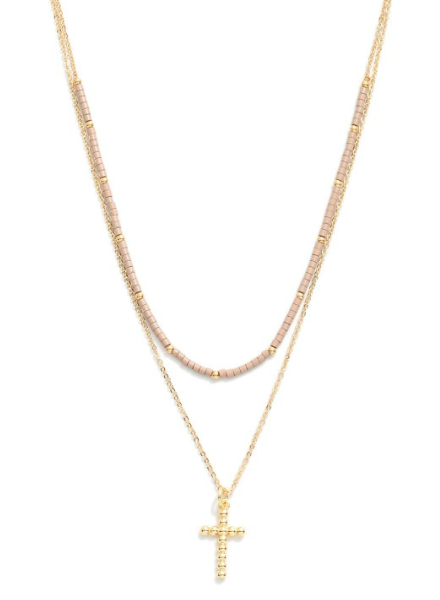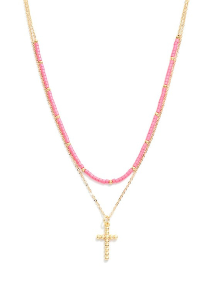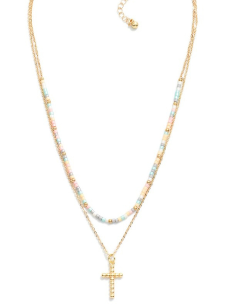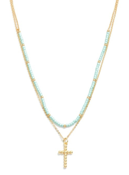 A double strand dainty necklace with a unique bubble style cross pendant. Choose your choice of color seed beads.