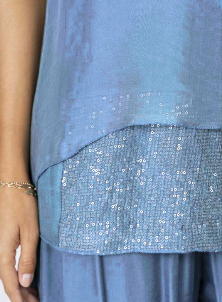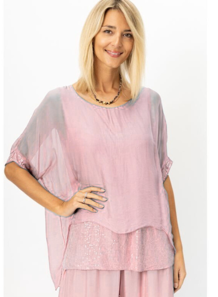 A beautiful silk blouse with simple lines and a simple silhouette. The hemline and cuff on the sleeve are embellished with matching tone sequins for a subtle, yet sparkly touch. A perfect top to bring on a cruise or for a special occasion such as weddings, graduations and much more. One size fits most. Made in Italy.