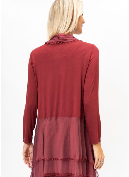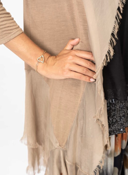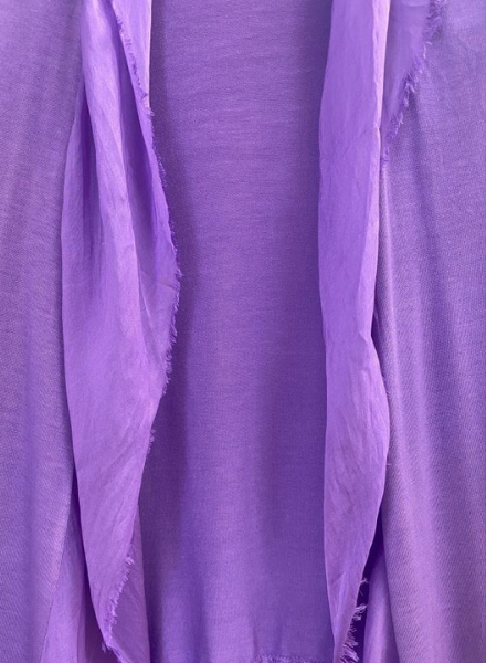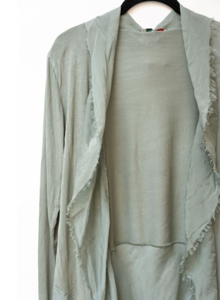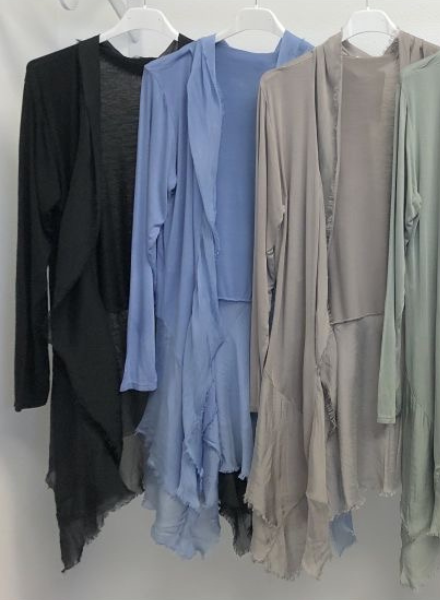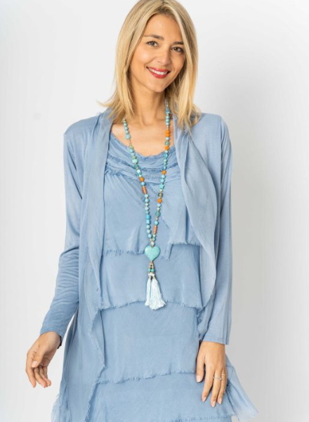 A beautiful lightweight, washable silk cardigan made in Italy. One size fits most. Cotton and elastic blended body with silk ruffles cascading down the front and lower back for a flattering, tiered silk look. Perfect for adding on top of a dress or formal outfit. Can easily be dressed down with more casual pieces as well!