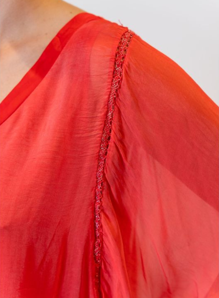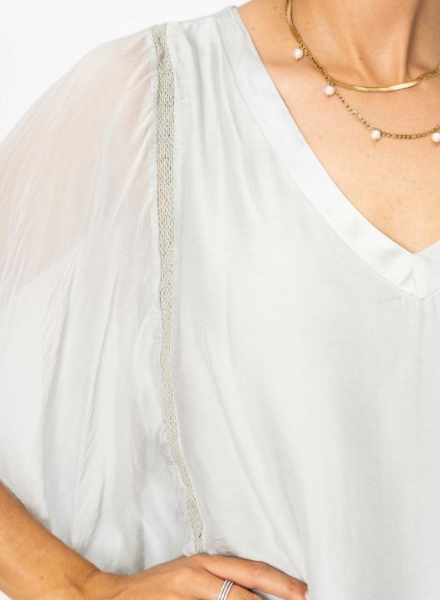 Washable Italian silk with a v-neckline and flutter style sleeves. The lining is a cotton and elastic blend that doesn't cling tight to the body, but moves with you while the silk on top flows beautifully! Gold thread lace trim details add just a touch of sparkle to the blouse. The hem is not too long, which some ladies might prefer. One size. Made in Italy.