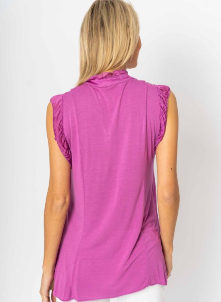 Heading into the warmer months you will want to stay cool! A beautiful shade of rich magenta silk flows weightlessly on top of a cotton and elastic blend liner. The front is the star of the show with ruffled sleeves and collar and long tendrils of silk, 3 functional mother of pearl buttons can be pinned up or down with a cami layered underneath based on your preference. One size fits most. Made in Italy.