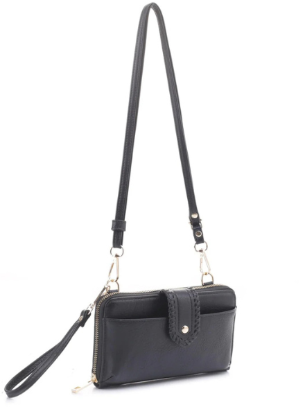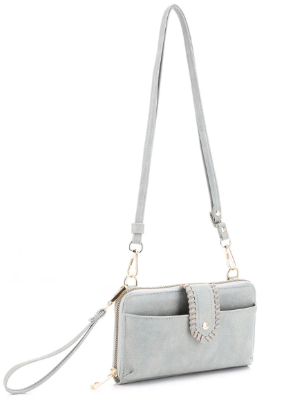 A small phone holder with a zippered compartment to securely store cash and cards. Includes a crossbody strap and wristlet. Available in so many shades of distressed faux leather.