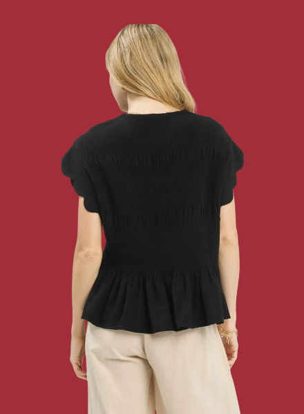 The detail of this linen cotton Blend Peplum Top is beautiful. Scalloped hem sleeves and a peplum fit give a slight ruffle to the hemline. This top pairs nicely with the Scallop Hem Pants if you'd like to mirror the scallop trip on the top's sleeve.