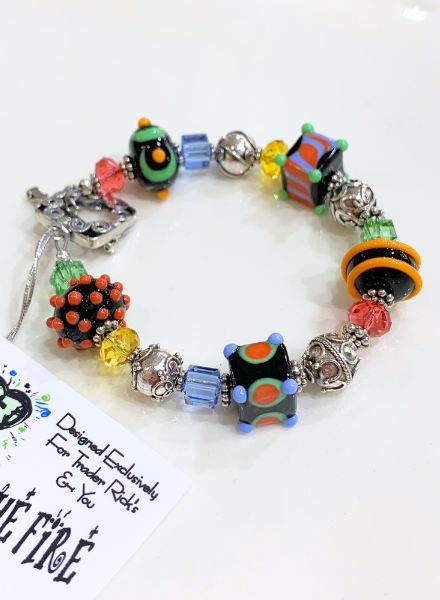 Pops of color contrasted on glossy black lampglass, handmade by Rick himself! Swirls, dots, stripes and cresent moon shapes make each bead unique. Your lampglass beads will have this design, but the sterling silver accents may vary. Swarovski crystals are also used in this piece.