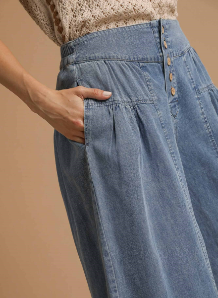 These light wash denim culottes are a nice way to add flow into your wardrobe. The button front detail adds interest to the pant with flattering lines. Perfect for pairing with an ankle boot!
