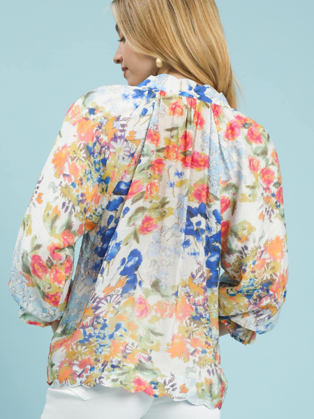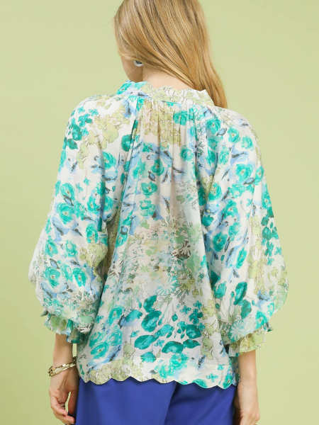 Whimsically painted watercolor florals color this top from front to back in two available colorways. Feel like a beautiful Monet masterpiece in this lightweight, lined 3/4 sleeve blouse.